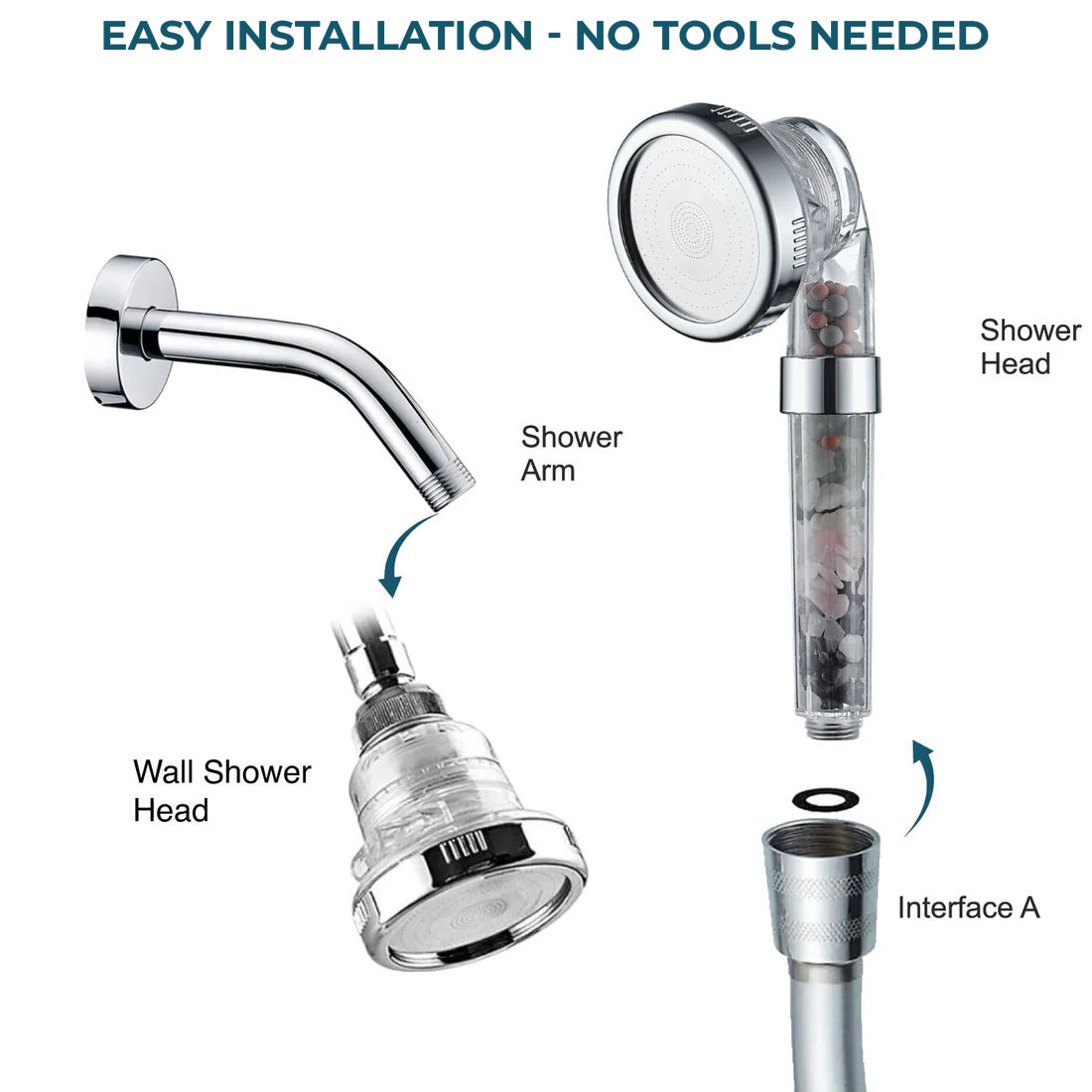 - Tome el conector Interfaz A y fijelo al extremo del flexo de su ducha. Apriete a mano hasta que quede firme.