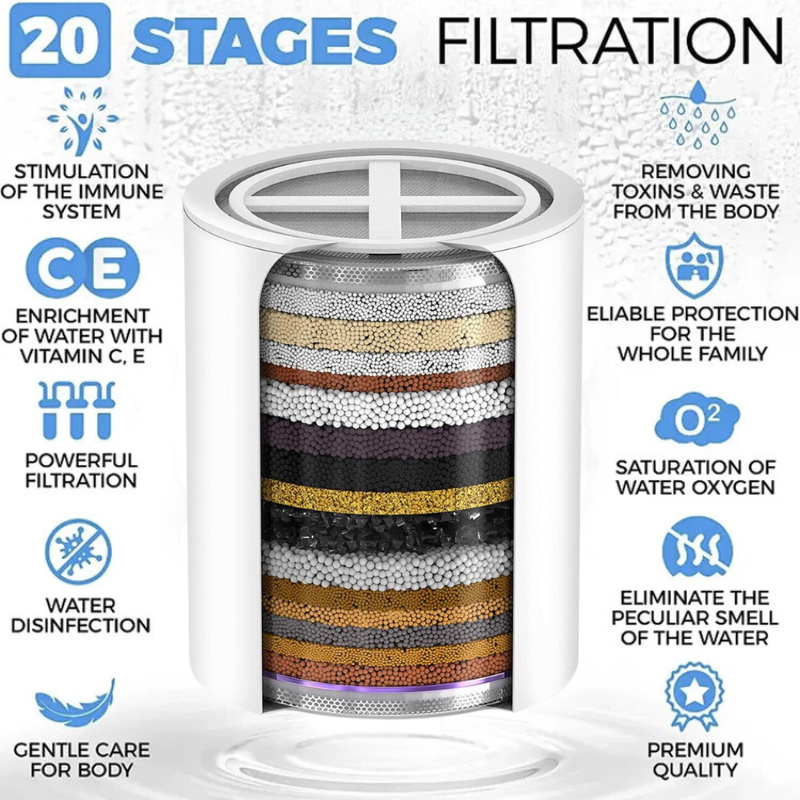 Innovador sistema de filtración de 20 etapas que comprende piedras minerales iónicas, ABS (acrilonitrilo butadieno estireno), algodón PP, vitamina C, KDF 55 y más para suavizar el agua dura y eliminar elementos no deseados como cloro, bacterias, suciedad y óxido.